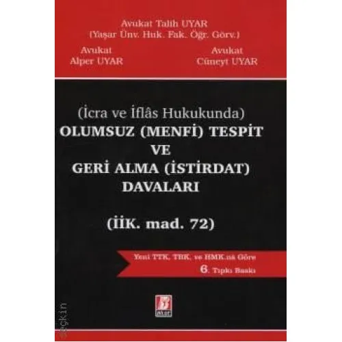 Talih Uyar, Alper Uyar ve Cüneyt Uyar’ın Olumsuz (Menfi) Tespit ve Geri Alma (İstirdat) Davaları adlı eseri, borç ilişkilerinde haksız ödeme ve borçsuzluk iddialarına dayalı davaları detaylı bir şekilde ele almaktadır. Kitapta, menfi tespit davasının açılma koşulları, borçlunun haklarını koruma yolları, istirdat davasının unsurları ve her iki dava türünün yargısal süreçleri kapsamlı şekilde incelenmektedir.